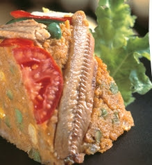 e deixe ferver.Junte o caldo e misture para dissolver.Acrescente os ingredientes restantes (menos a farinha de milho) e misture. Junte, aos poucos, a farinha de milho e misture com cuidado (a massa não deve ficar muito consistente).Reserve.Decore o fundo e as laterais de uma fôrma pequena com furo central untada, com as sardinhas os pimentões, o ovo e o tomate.Coloque a mistura reservada.Leve ao forno (médio) por 10 minutos. Espere amornar um pouco e desenforme.